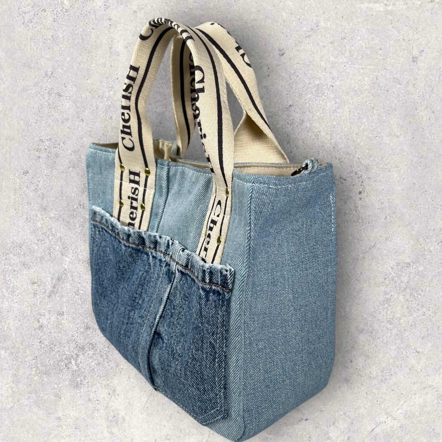 ロゴ入り持ち手のデニムバッグをお届けします!