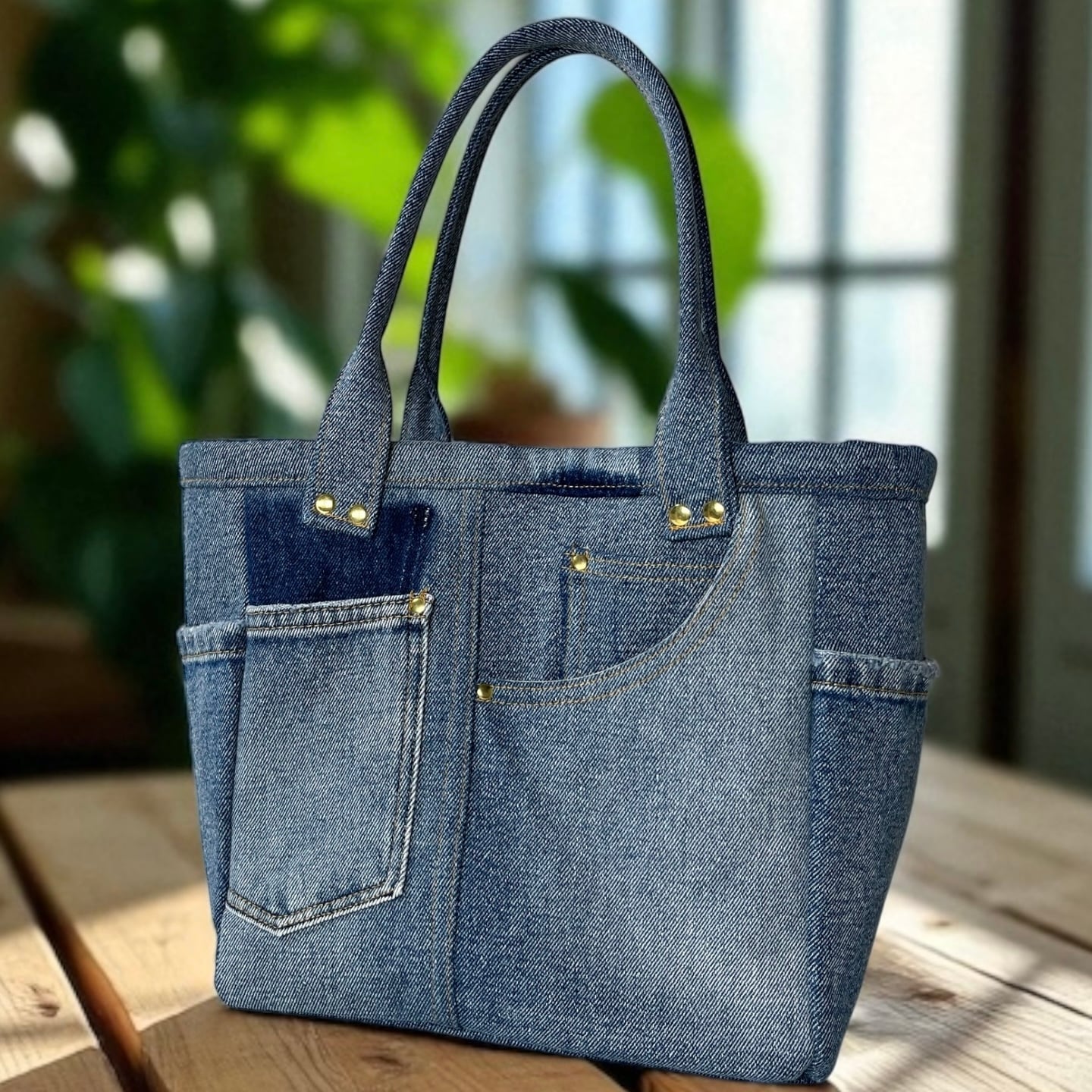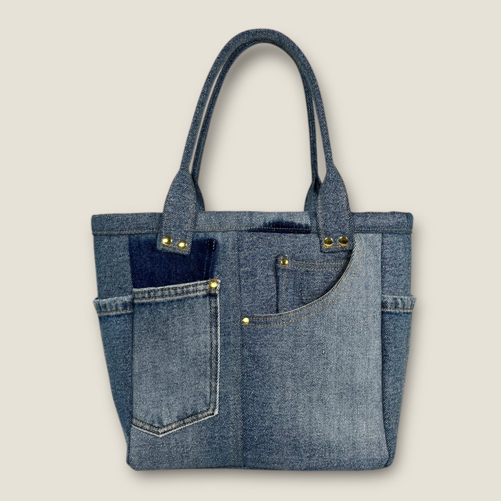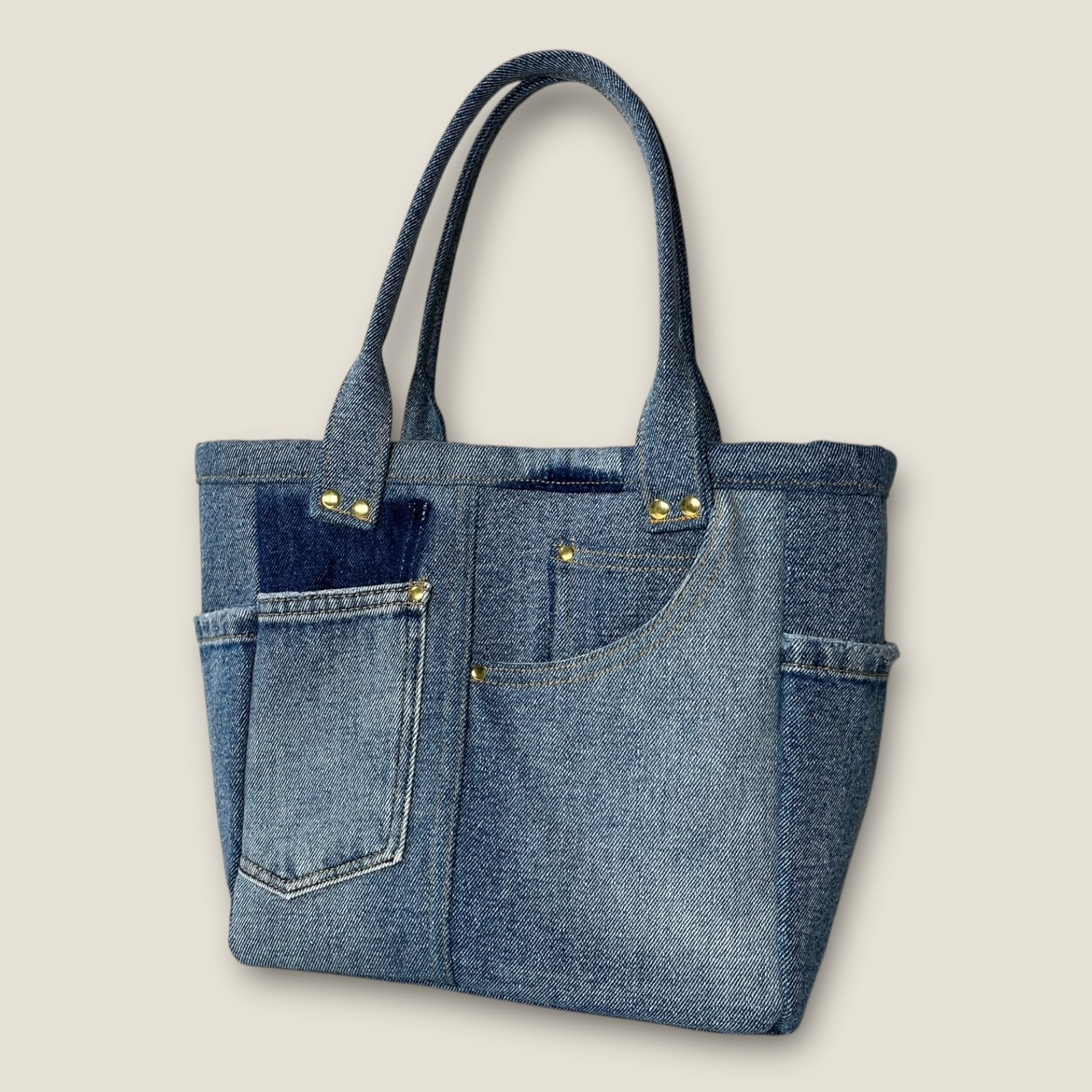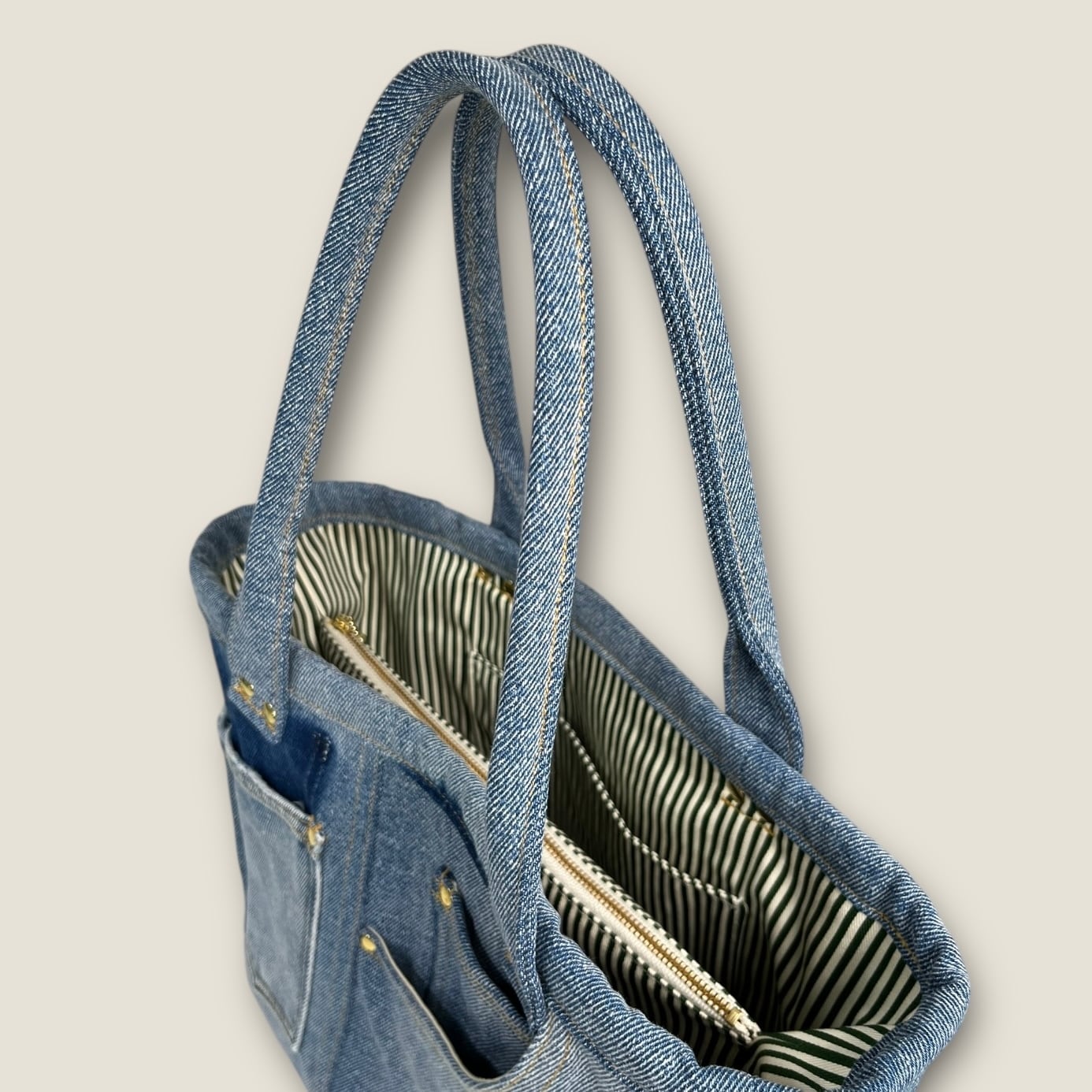 ファスナー仕切り付きポケットのデニムトートバッグ