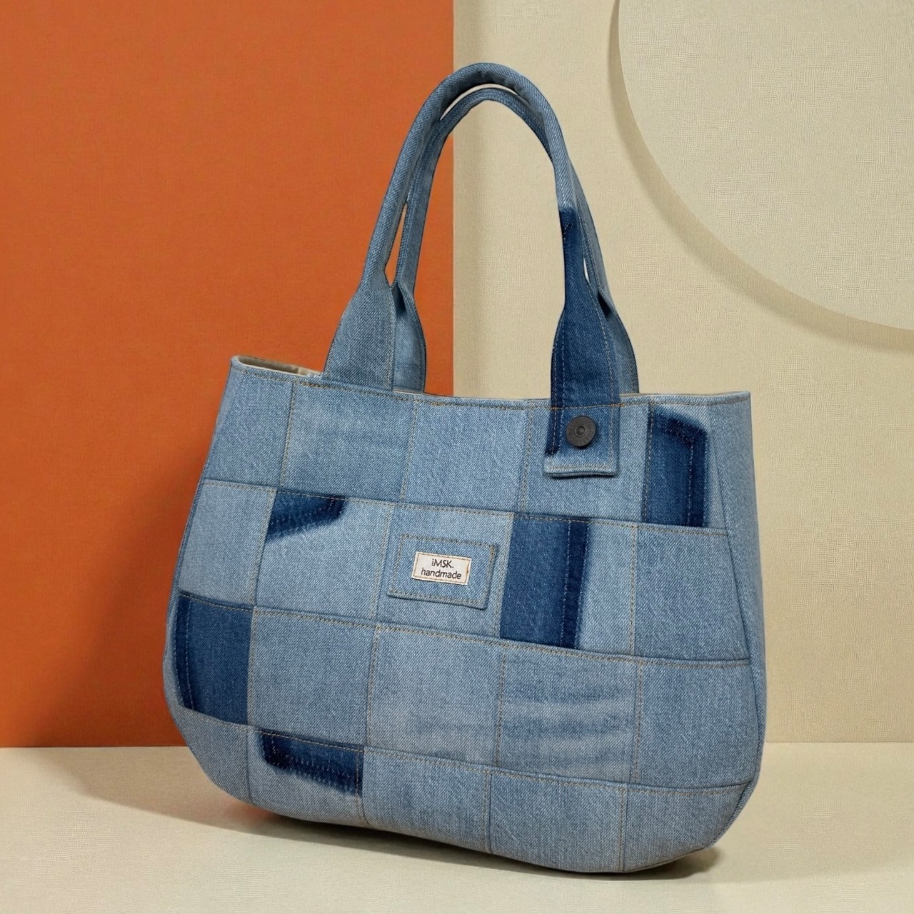 パッチワークデザインのラウンドデニムバッグ