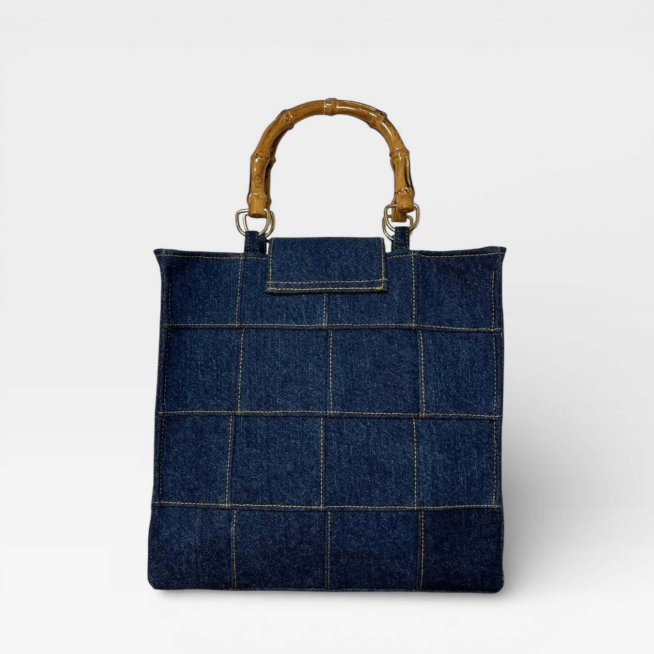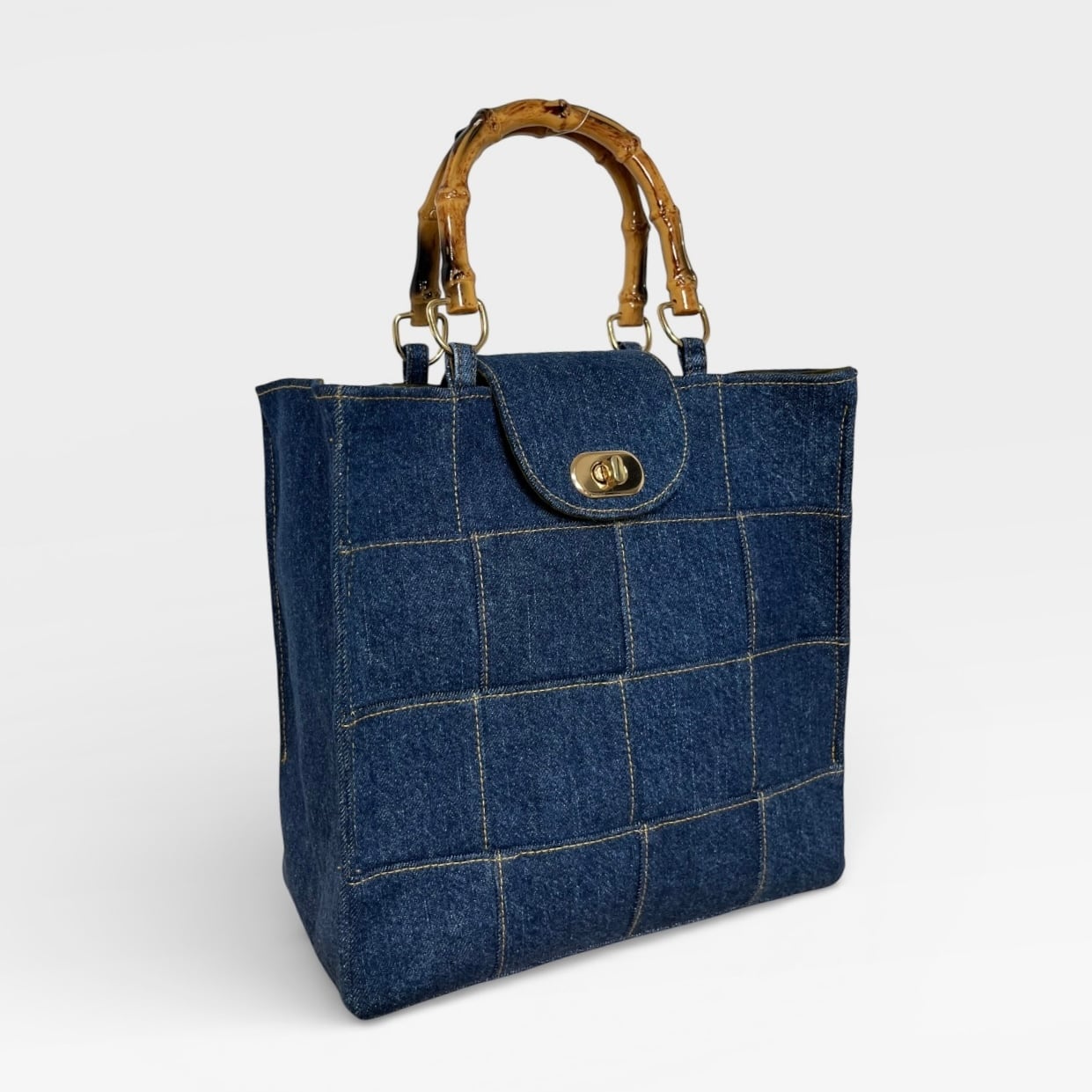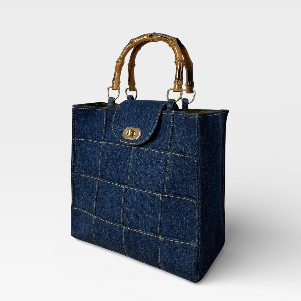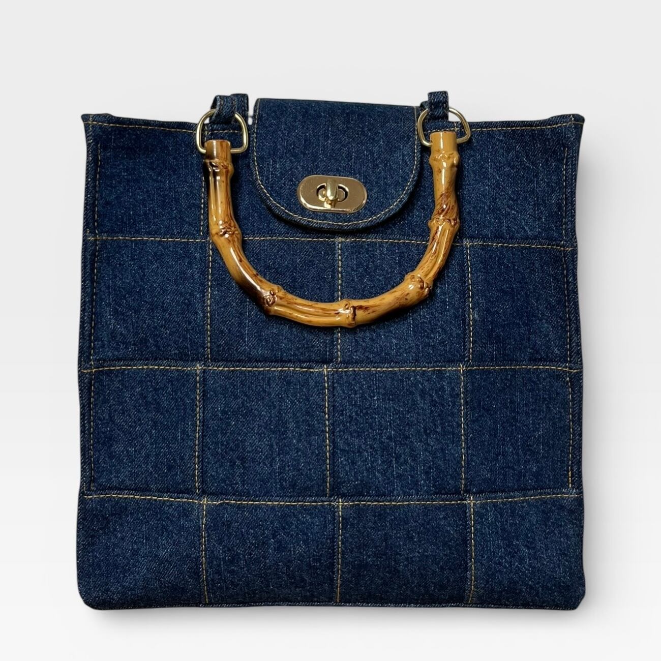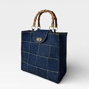 捻り錠が付き★デニムのパッチワークトートバッグ