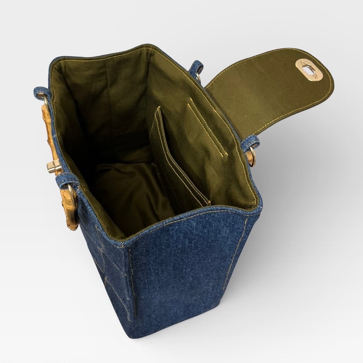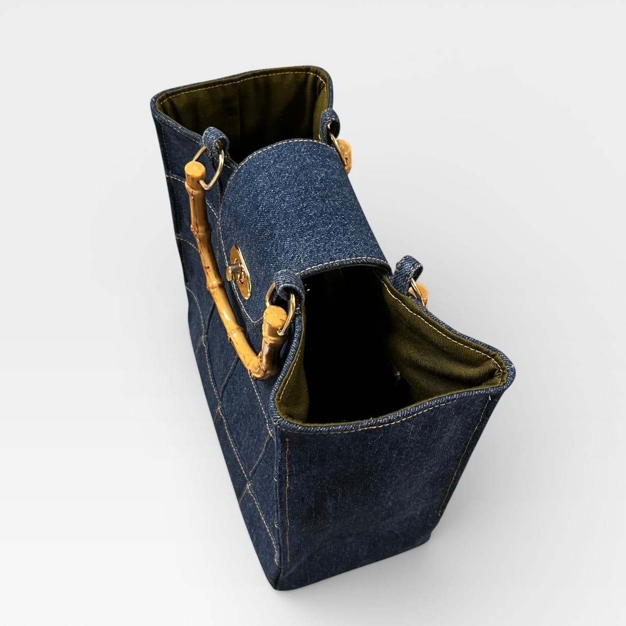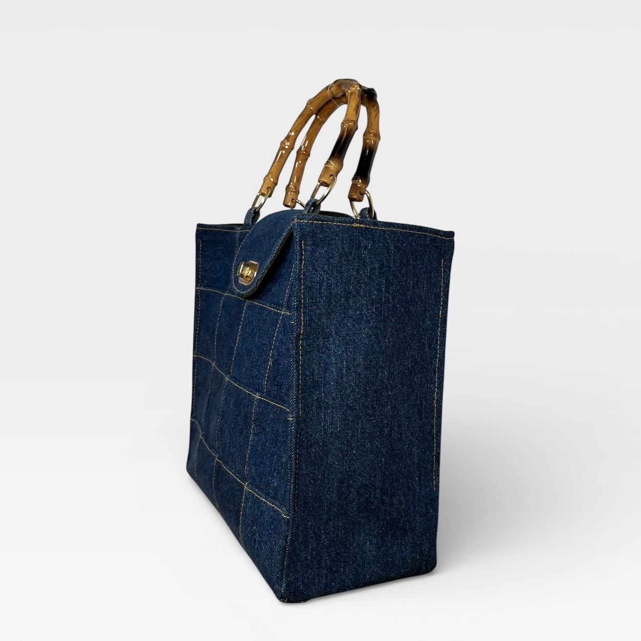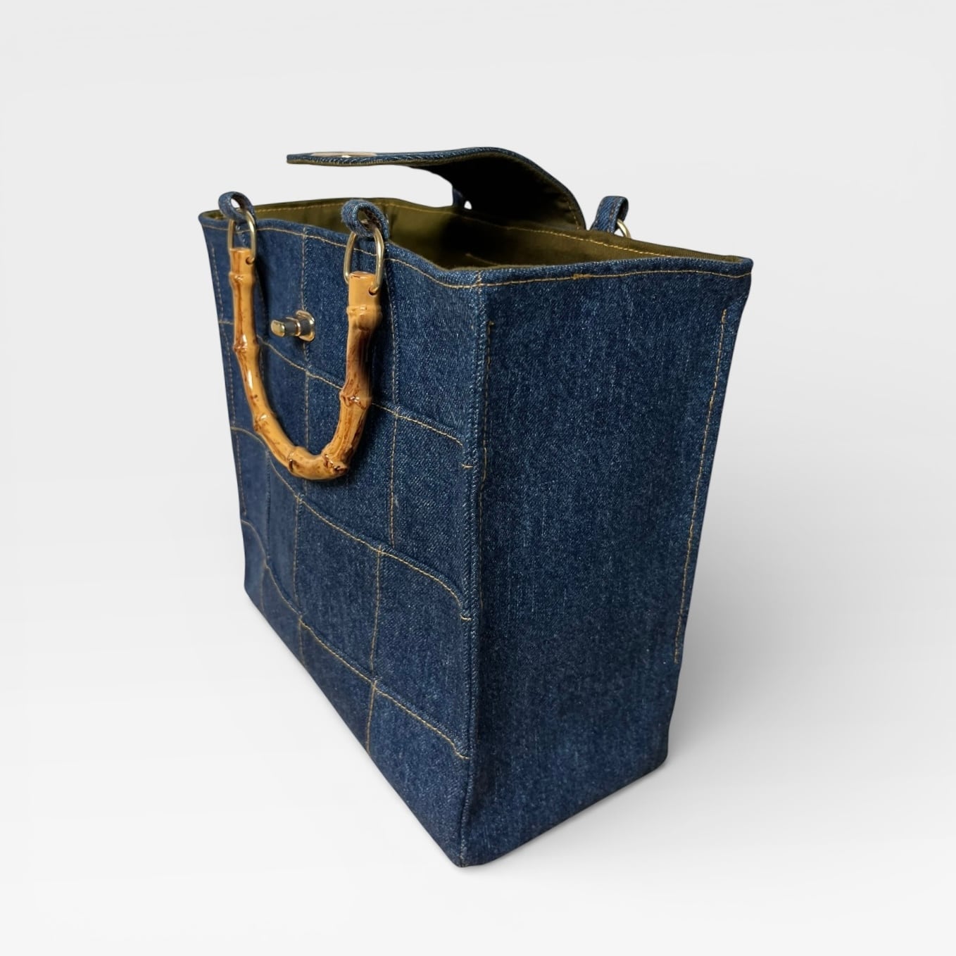 捻り錠が付き★デニムのパッチワークトートバッグ