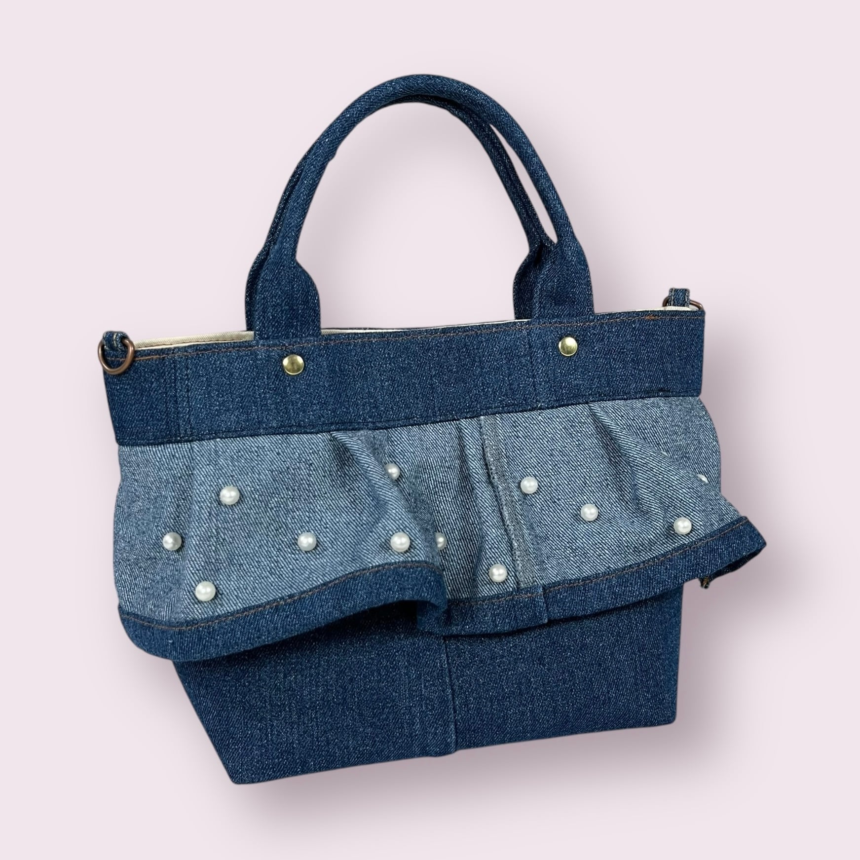 【Sサイズ】フリル&パール付きデニムトートバッグ