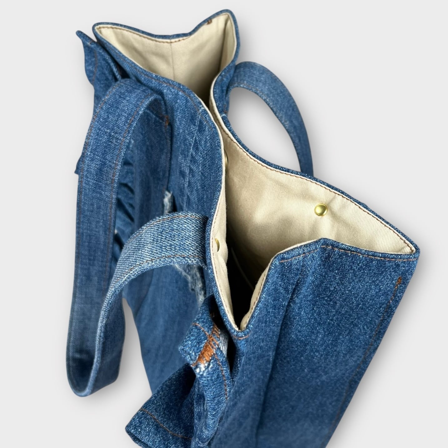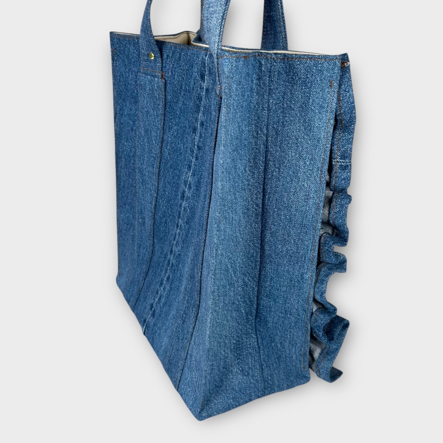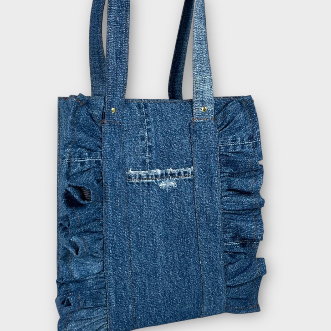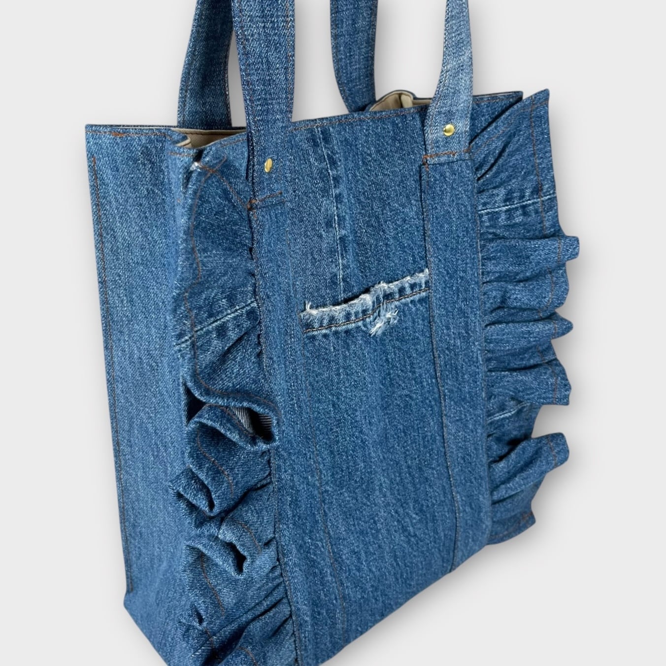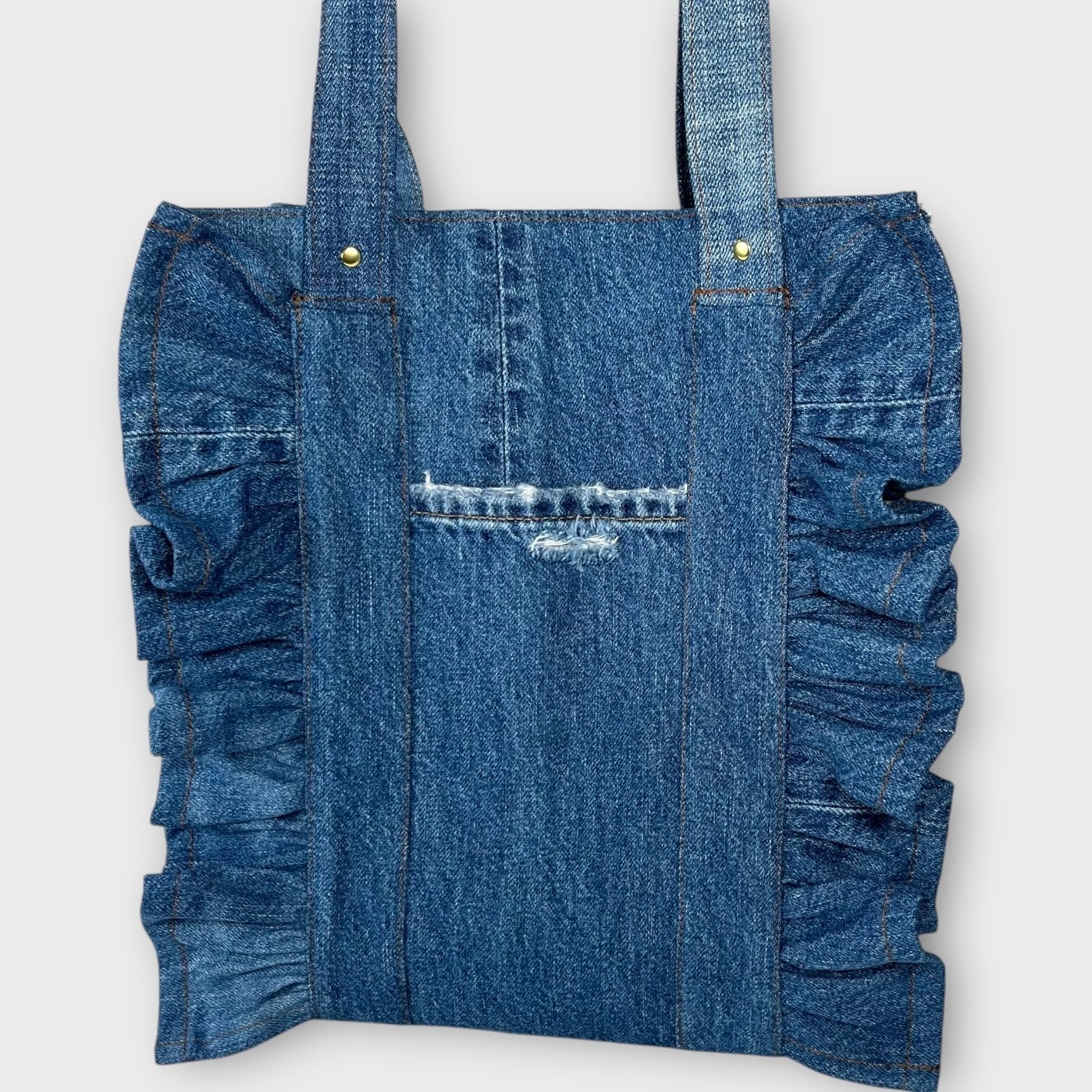 肩掛けできるデニムのフリルトートバッグをお届けします!